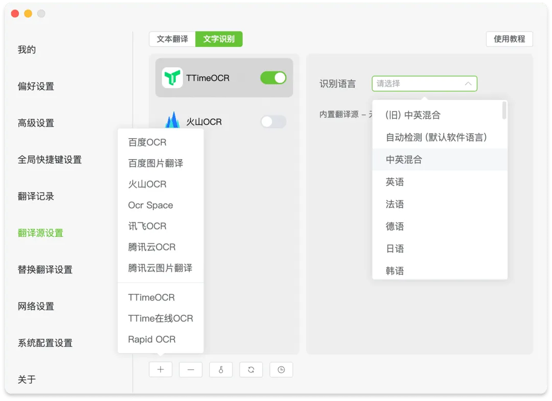 用户同样可以在软件内置识别源,以及第三方 OCR 服务中自由选择。
