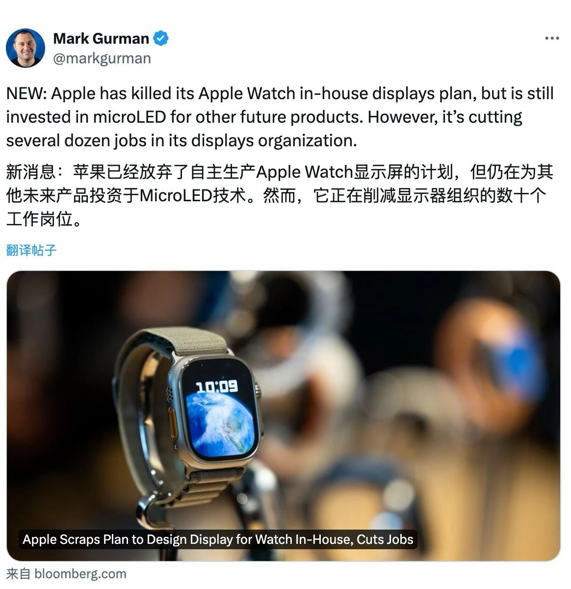 彭博社Mark Gurman撰文:苹果已取消其Apple Watch内部显示屏计划,但仍然对其他未来产品的microLED技术有足够兴趣。