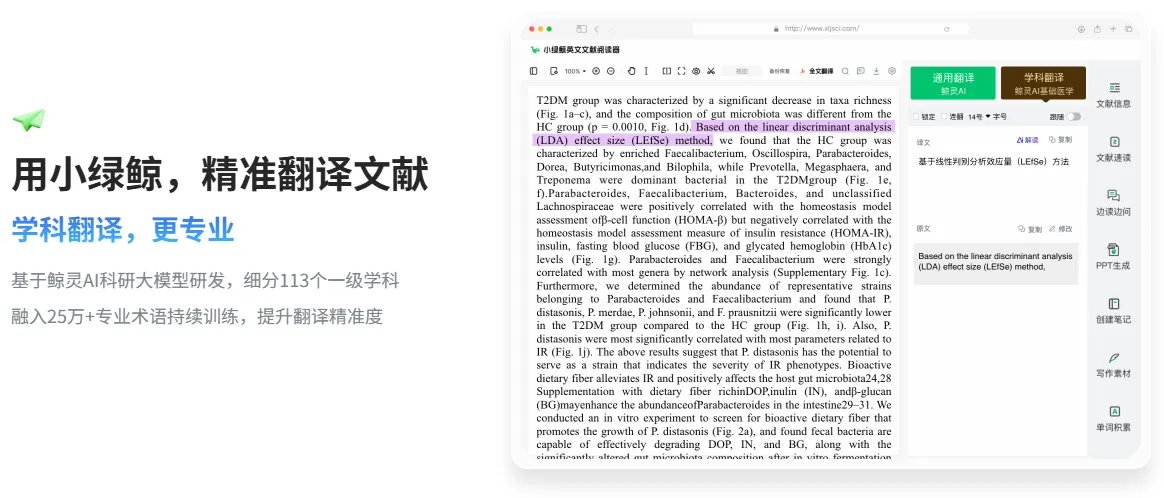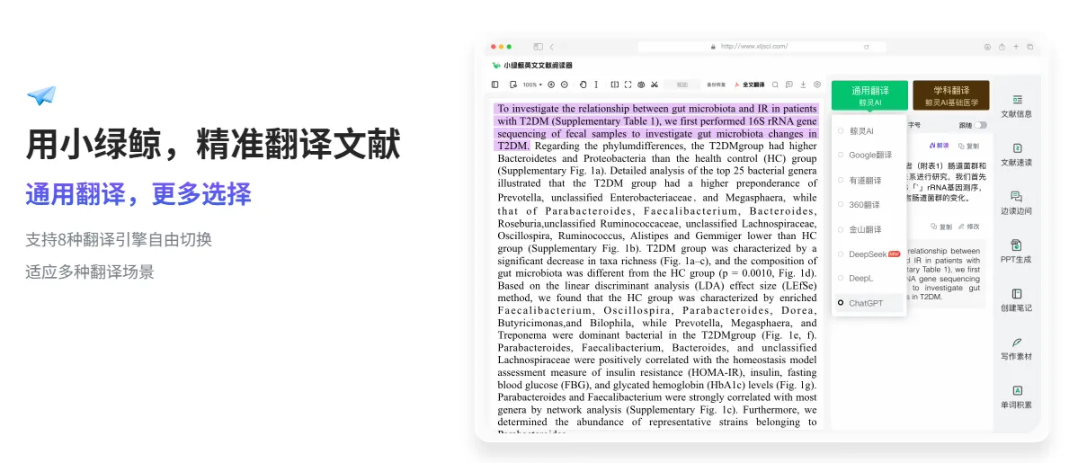 小绿鲸是一款集翻译、笔记、文献管理、文献汇报、写作功能于一体的云端英文文献阅读器。