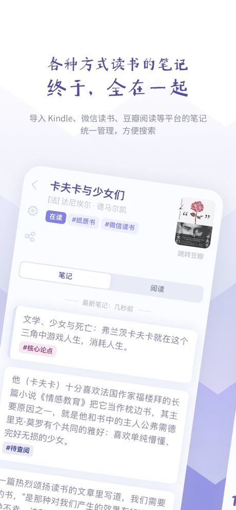如果你和我一样在 Kindle、微信读书、豆瓣阅读等多个平台读书,有时候还读读纸质书,笔记散落在各处。那么,众山小读书笔记就是终极解决方案!